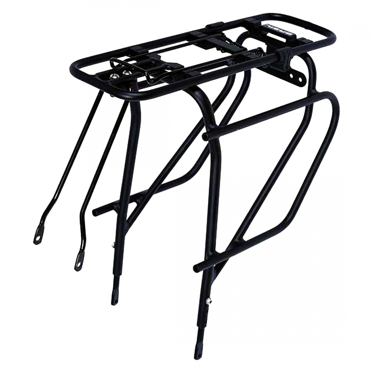 Universal rear cargo rack with integrated pannier bars and top clamping spring for a jacket or other loose lightweight gear