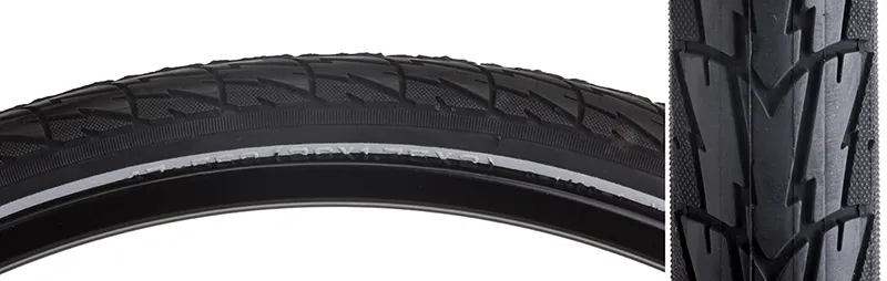 City/trekking tire with Kevlar to reduce punctures, reflective sidewall for visibility.