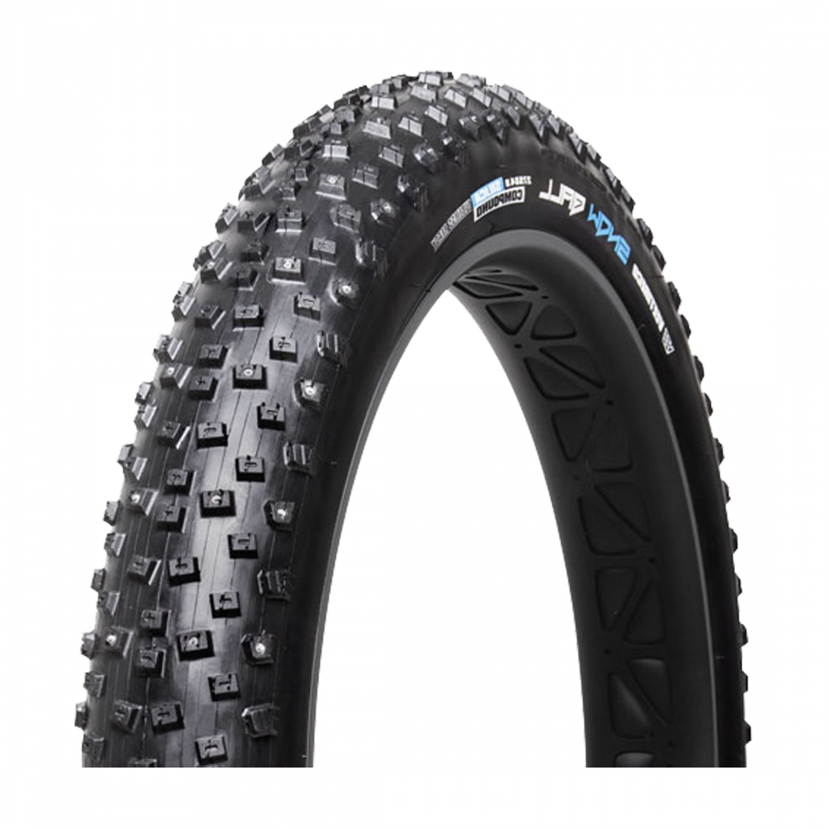 A truly all terrain tire designed for grip on snow, hard pack, loose dirt or grass via its well spaced large square knobs